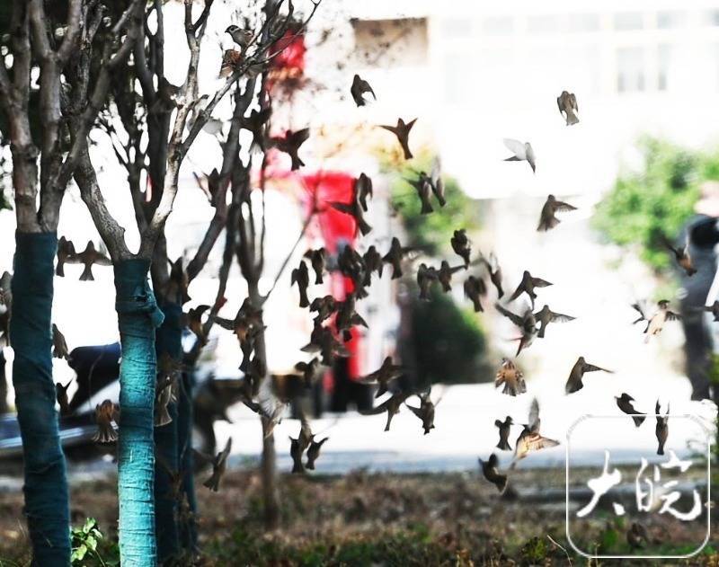 r大皖新闻记者看到,镇政府大院里鸟声不绝。有几棵枝叶茂盛的玉兰树,粗大的树冠里,成百上千只鸟儿在绿叶间栖息,这里俨然鸟的乐园;绿化带里有一些小树,虽然叶子落完了,但仍有许多小鸟在树枝上栖息,远远望去,仿佛树枝上“长出鸟形的叶子”;偶尔有人经过,绿化带里立刻飞起一群鸟。
