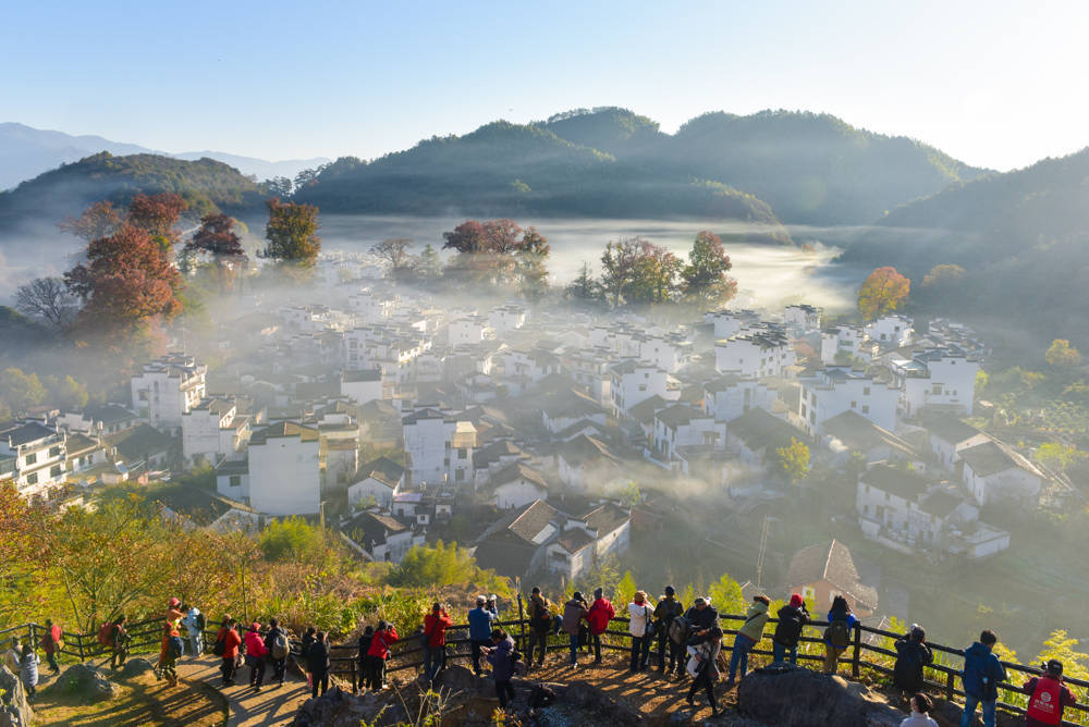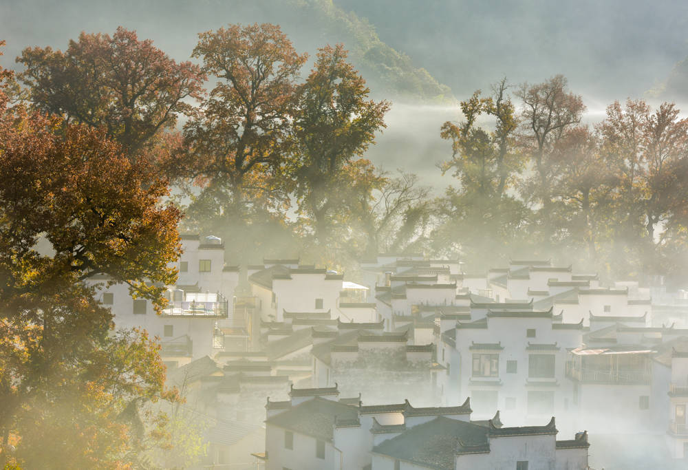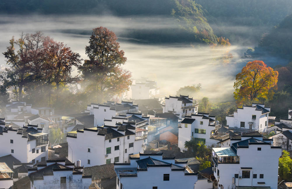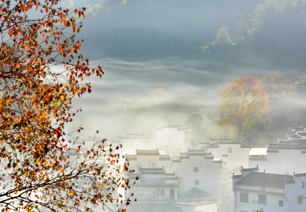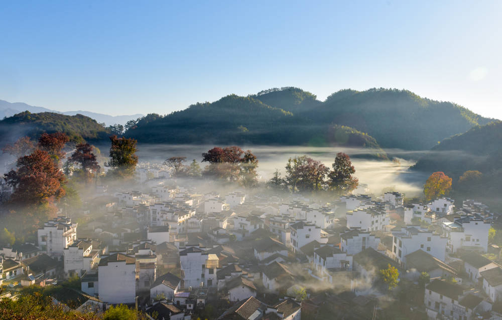 初冬时节,江西省上饶市婺源县大鄣山乡石城村晨雾缭绕,一幢幢粉墙黛瓦的徽派民居与红枫交相辉映,勾勒出一幅多彩乡村画卷,美不胜收。