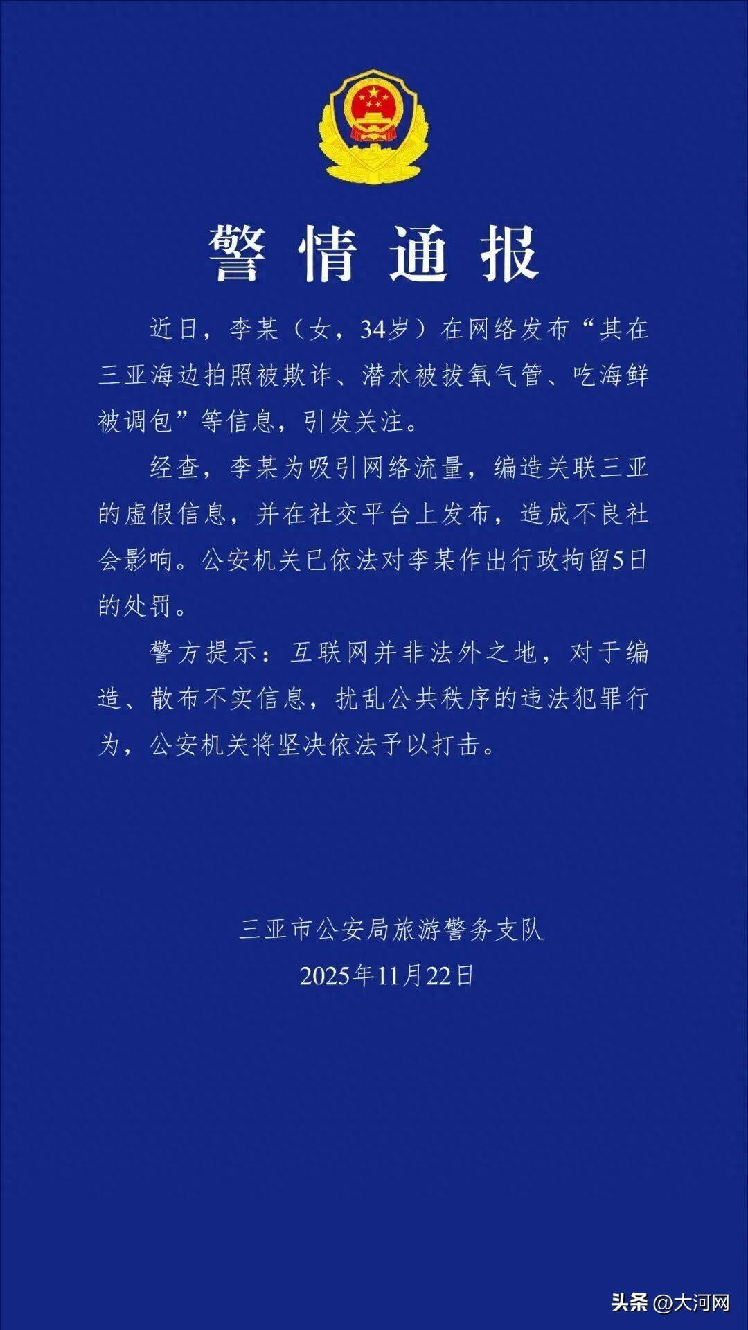 通报称,近日,李某(女,34岁)在网络发布“其在三亚海边拍照被欺诈、潜水被拔氧气管、吃海鲜被调包”等信息,引发关注。