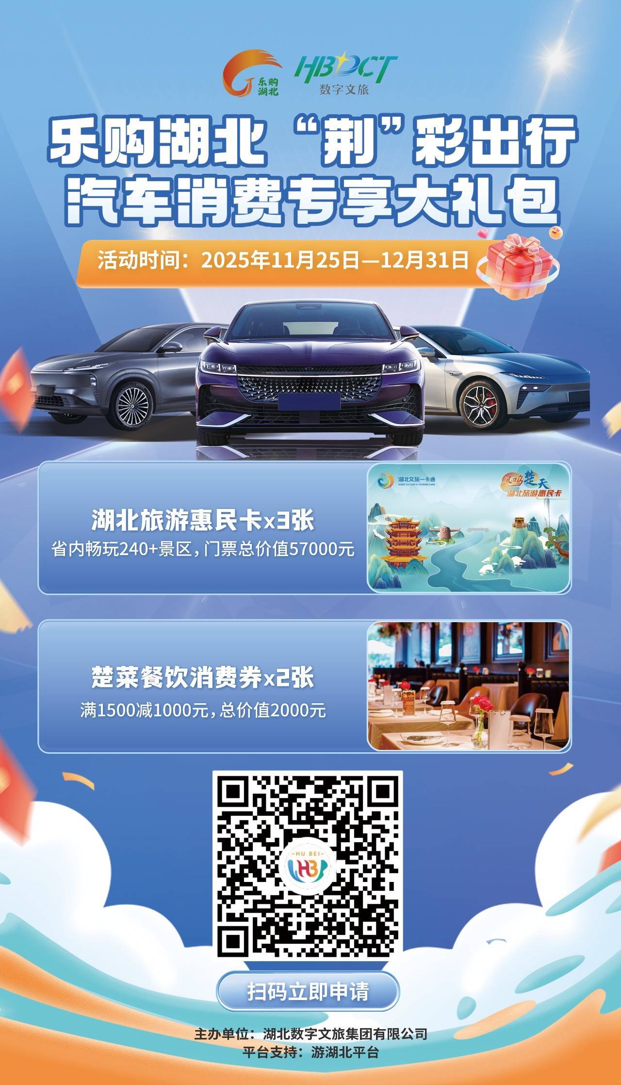凡在湖北省内购置合作车企品牌车辆的个人消费者,且机动车销售发票开票日期为2025年11月25日至12月31日、新车行驶证登记日期为2025年11月25日至2026年1月10日,同时申领人、购车人及行驶证登记所有人为同一人的,可于2025年11月25日至2026年1月10日期间,登录“游湖北”平台活动专区参与申领,成功后可获得含以下权益的消费大礼包1份。