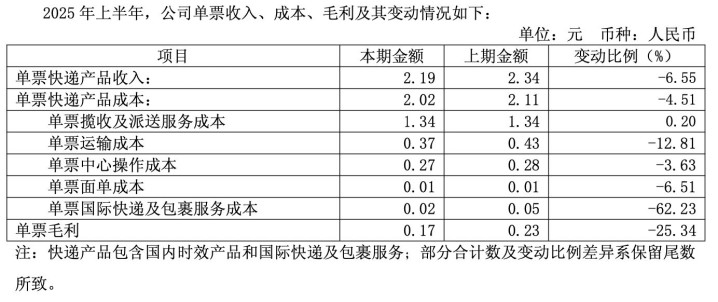 圆通速递在财报中提及,上半年,由于单票成本持续下降和行业市场竞争等因素影响,公司单票快递产品收入2.19元,同比降幅6.55%。