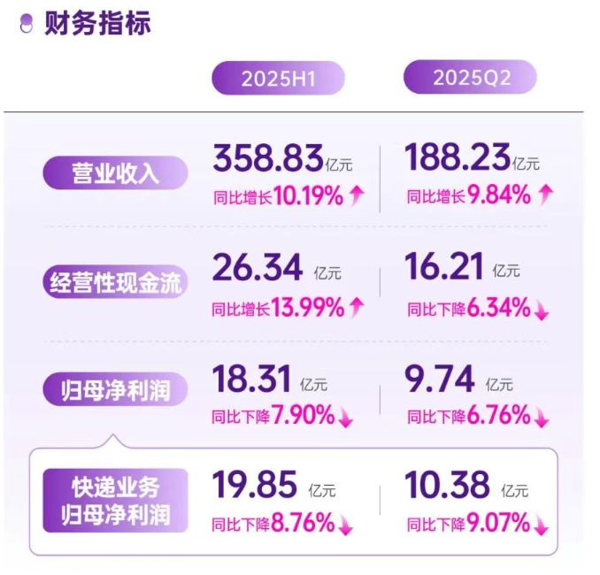 8月27日晚间,圆通速递(SH.600233,股价18.25元,总市值624.19亿元)发布了2025年中期业绩报告。数据显示,圆通速递上半年实现营业收入358.83亿元,同比增长10.19%;归母净利润18.31亿元,同比下降7.90%。
